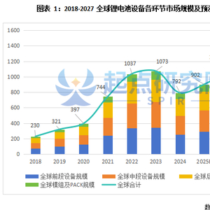 起点研究院SPIR预计到2027年全球锂电设备市场规模达1419亿元,其中前段设备市场规模为460亿元,中段设备市场规模为434亿元,后段设备市场规模为383亿元,模组及PACK市场规模为142亿元。