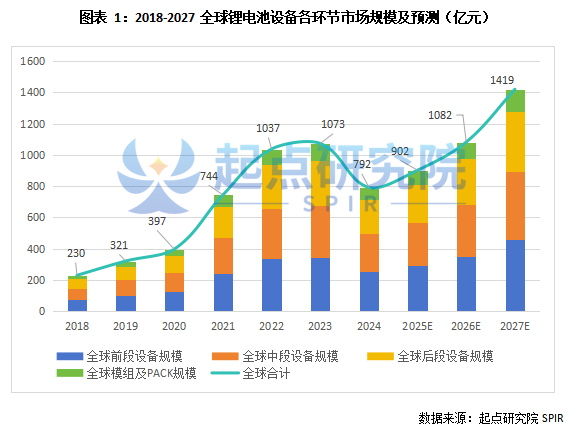 起点研究院SPIR数据显示,2024年全球锂电池设备规模为792亿元,同比下降26.2%。下降主要原因为下游锂电池企业扩产进度放缓及锂电设备价格下降。前两年锂电池行业处于竞争白热化状态,内卷加剧,但长期来看,下游新能源汽车及储能市场对锂电池需求增长明确,同时叠加退役设备的更新换代及产线改造,锂电池设备需求未来2-3年将呈持续增长态势。