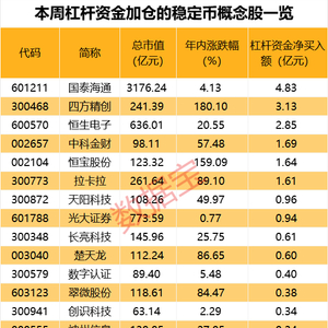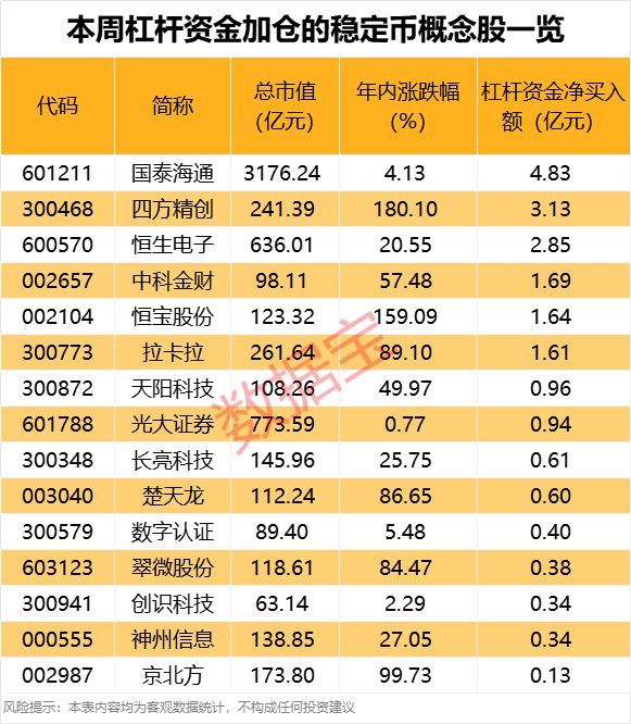 从资金面来看,15只稳定币概念股本周获得杠杆资金加仓,国泰海通、四方精创、恒生电子、中科金财、恒宝股份、拉卡拉的杠杆资金净买入额居前,均超1亿元。