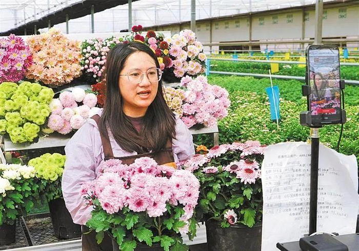 姚安县云秀花卉基地直播销售鲜花。杨龙 摄(中经视觉)