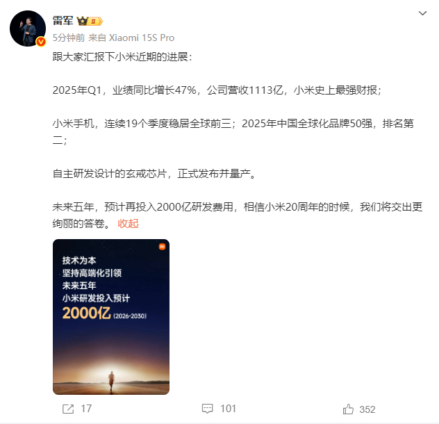未来五年,预计再投入2000亿研发费用,相信小米20周年的时候,我们将交出更绚丽的答卷。
