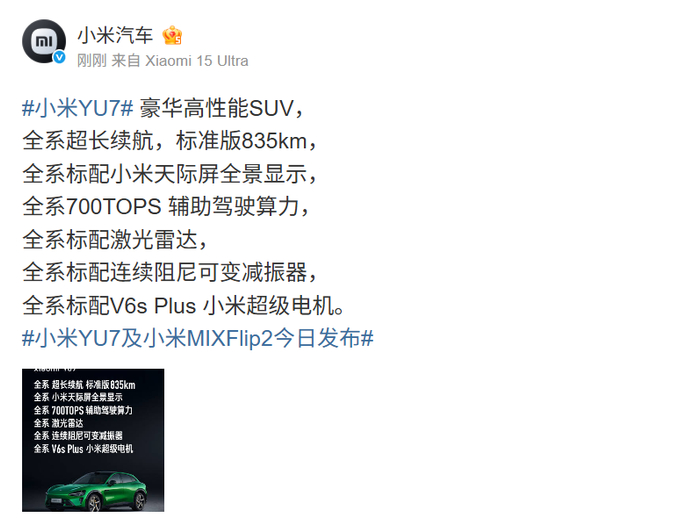 发布会上,雷军公布了小米YU7的价格:YU7标准版25.35万元,YU7 Pro27.99万元,YU7 Max 32.99万元。