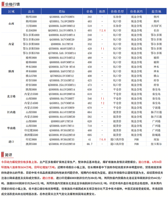 1、主产区煤价稳中上探,近期中小煤矿月度生产任务完成停产减产增多,坑口供应逐步收紧,目前化工及站台大户采购积极,受港口涨价及迎峰度夏预期,市场情绪向好,站台及煤场等贸易商补库需求有所释放,部分在产煤矿拉煤车增多,涨价持续小涨,此外少数煤矿持续上涨后,拉煤车有所下降,后期多关注下游接受度及需求持续情况。港口方面,港口市场报价趋稳,下游观望,还盘压价,市场成交较少。部分市场参与者表示,下游仅有零散需求采购,且对价格的接受程度不高,价格上涨动力不足,但目前煤矿价格持续上涨,港口发运倒挂,结构性缺货情况暂未缓解,贸易商对市场有一定预期,低价出货意愿不强,价格下行阻力较大,市场僵持,预期价格短期或窄幅波动为主。进口方面,进口印尼低卡煤需求增加,空单低价不好补货,即期货源报价偏高,矿方有惜售现象,大船3800大卡煤报价FOB41-42.5美金,投标价集中在380元左右。中高卡煤需求不多,支撑不强,5500大卡到岸640-650元。
