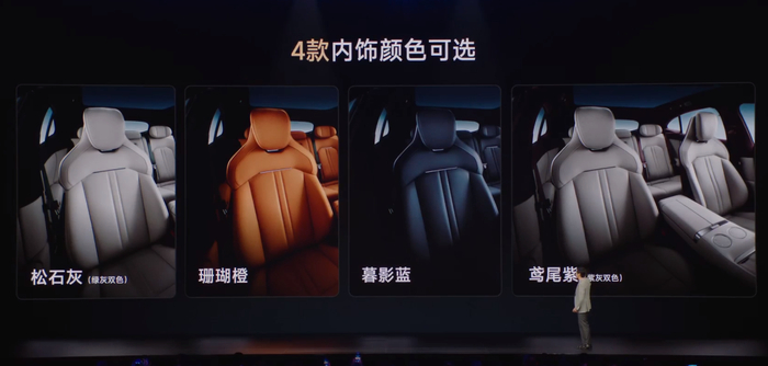 雷军表示,YU7有三种轮毂尺寸和四款内饰颜色可供选择,内饰颜色分别是松石灰、珊瑚橙、暮影蓝和鸾尾紫。车辆后排座椅支持电动调节,最大调节角度是135度,还可以一键电动放倒,秒变一米八大床。此外,车辆还配备两个80瓦的无线充电装置,化妆镜、以及车载智能冰箱等。