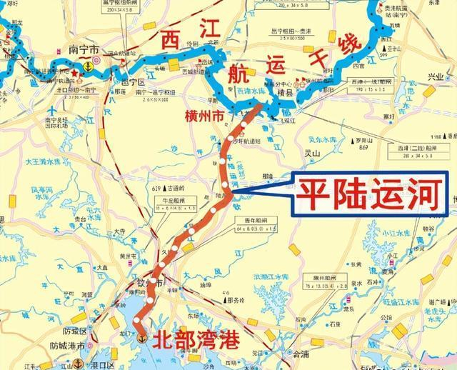 平陆运河起点在广西南宁横州市西津库区平塘江口,经广西钦州市灵山县陆屋镇沿钦江进入北部湾,全长约135公里,预计造价700亿。
