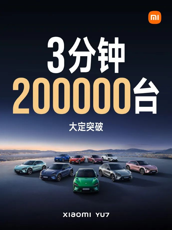 当晚的“重头戏”是小米汽车发布的首款SUV——小米YU7。雷军表示,该款车型起售价25.35万元。在发布会结束后,小米汽车微博更新显示,小米YU7 3分钟大定突破20万台;一小时大定突破28.9万台。