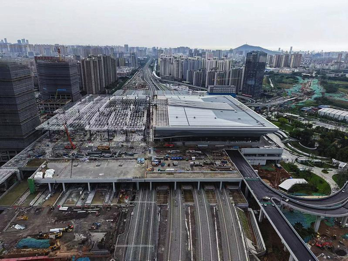 当日下午,记者看到合肥西站施工现场一派热火朝天的忙碌景象。合肥西站西侧站房主体工程已经完成,正在进行室内的装饰装修和机电配套施工。