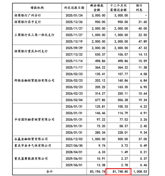 另一方面,友升股份在对外采购铝水、铝棒、铝型材等原材料时,结算方式以预付为主,营运资金需求量极大。在此背景下,公司只能依靠举债的形式进行融资。数据显示,2021年-2024年,友升股份短期借款余额由2.88亿元大幅飙升至9.89亿元,过去四年短期借款增幅超过3倍。截至2024年年末,公司货币资金余额仅为8449.81万元,而公司未来十二个月内需偿还金额合计为8.18亿元,短期偿债风险突出。