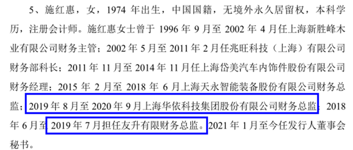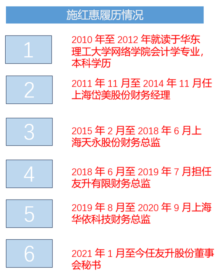 2011年起,施红惠共以财务总监身份服务过4家IPO公司(上海岱美股份2017年上市,不过施红惠担任的时财务经理,且离职较早)。从天永股份开始,施红惠开始担任IPO公司的财务总监, 天永股份2018年1月登陆上交所;5个月后,施红惠辞职,成为友升股份财务总监;2019年8月又进入华依科技,2020年9月,也就是在施红惠入职华依科技一年之后,施红惠又从华依科技财务总监这一关键岗位辞职,回到友升股份,而这个时间点正值华依科技上会前三个月左右。