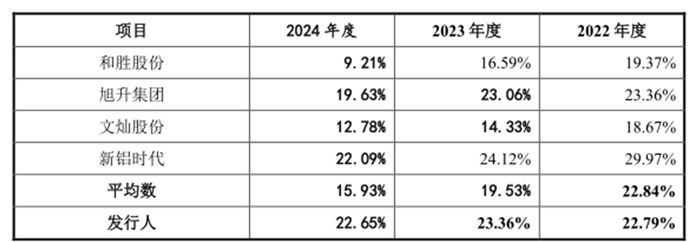 除了经营性现金流表现不佳之外,友升股份的毛利率表现也较为异常,并遭到监管层的反复问询。首版招股书显示,2022年-2024年,友升股份销售毛利率分别为22.79%、23.36%和22.65%,对比看,包括旭升股份在内的可比上市公司同行毛利率平均值分别为22.84%、19.53%和15.93%。
