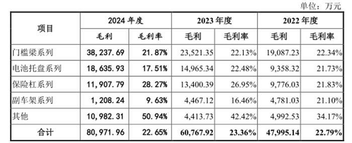 分产品来看,友升股份各类产品毛利率变动趋势存在一定差异。2022年-2024年,电池托盘系列产品毛利率自21.73%下降至 17.51%,副车架系列产品毛利率由21.1%下降至9.63%,保险杠系列产品毛利率自 21.83%上升至 28.27%。