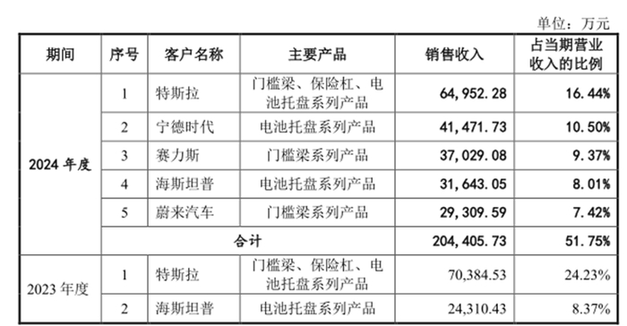 招股书显示,自2021年以来,特斯拉跃升为友升股份第一大客户,销售产品包括保险杠、门槛梁、电池托盘等产品。2021年-2023年,友升股份对特斯拉的销售收入分别为1.8亿元、4.75亿元、7.04亿元,营收占比分别约为11.94%、20.2%、27.31%,单一客户依赖度不断增加。
