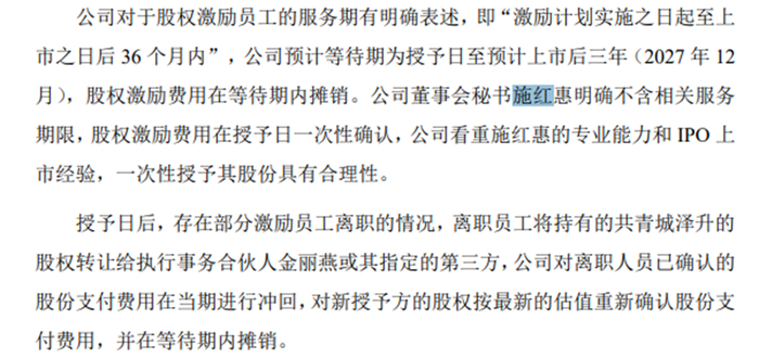 值得注意的是,施红惠参加股权激励计划时还享受到了“特殊待遇”。根据招股书,友升股份对于股权激励员工的服务期有明确表述,即“激励计划实施之日起至上市之日后 36 个月内”,公司预计等待期为授予日至预计上市后三年(2027 年 12 月),股权激励费用在等待期内摊销。但是,公司董秘施红惠明确不含相关服务期限,股权激励费用在授予日一次性确认。友升股份将这一特殊安排解释为“公司看重施红惠的专业能力和 IPO 上 市经验,一次性授予其股份具有合理性”。
