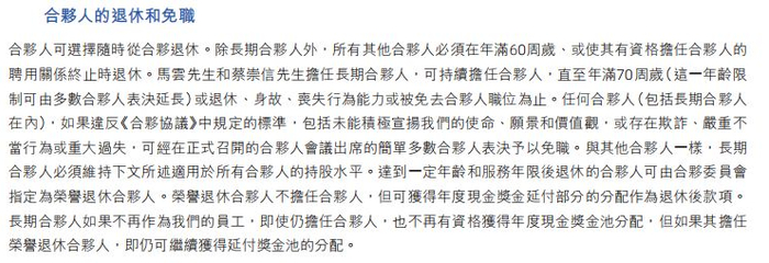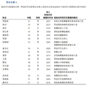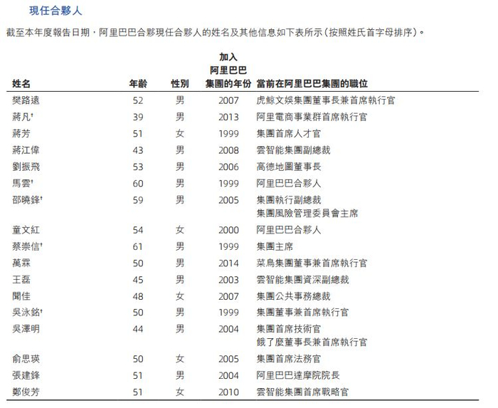 记者发现,其合伙人总人数由上一年的26人减少至17人。17人分别为:樊路远、蒋凡、蒋芳、蒋江伟、刘振飞、马云、邵晓锋、童文红、蔡崇信、万霖、王磊、闻佳、吴泳铭、吴泽明、俞思瑛、张建锋、郑俊芳。退出合伙人之列的为戴珊、方永新、彭蕾、宋洁、孙利军、武卫、俞永福、张勇、朱顺炎等9人。