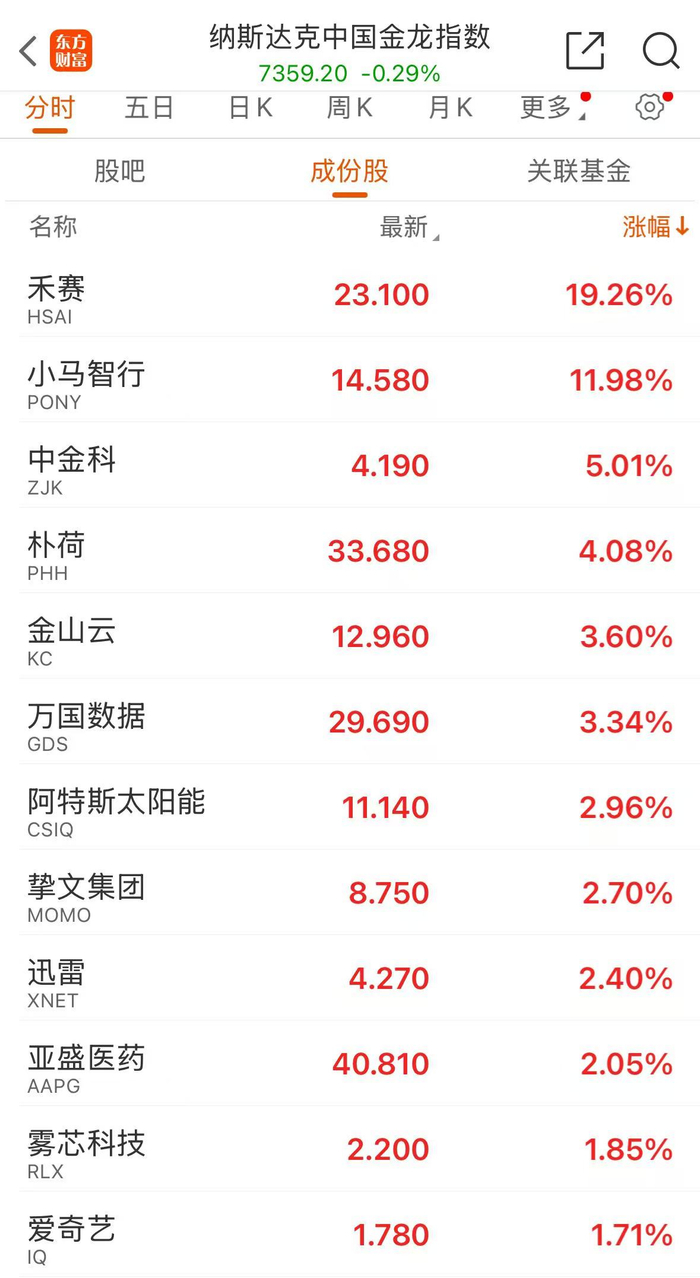 热门中概股涨跌不一,纳斯达克中国金龙指数跌0.29%。小马智行涨约12%,金山云、万国数据涨超3%,霸王茶姬、亚朵涨超1%,京东、贝壳、好未来小幅上涨;小鹏汽车跌超6%,满帮、再鼎医药跌逾2%。