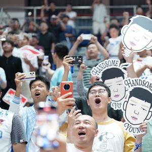 26日上午,在青岛国信钻石体育馆,球迷们起立庆祝杨瀚森首轮选秀成功。