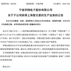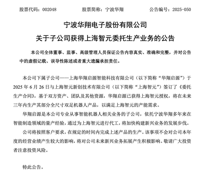 6月26日晚,宁波华翔公告称,公司下属子公司上海华翔启源智能科技有限公司(简称“华翔启源”)于2025年6月26日与上海智元新创技术有限公司(简称“智元机器人”)签订了《委托生产合同》,基于双方资产、团队及其他资源,华翔启源已获得智元机器人授权,将在未来三年内生产其部分全尺寸双足机器人产品,以满足智元机器人的产能需求。