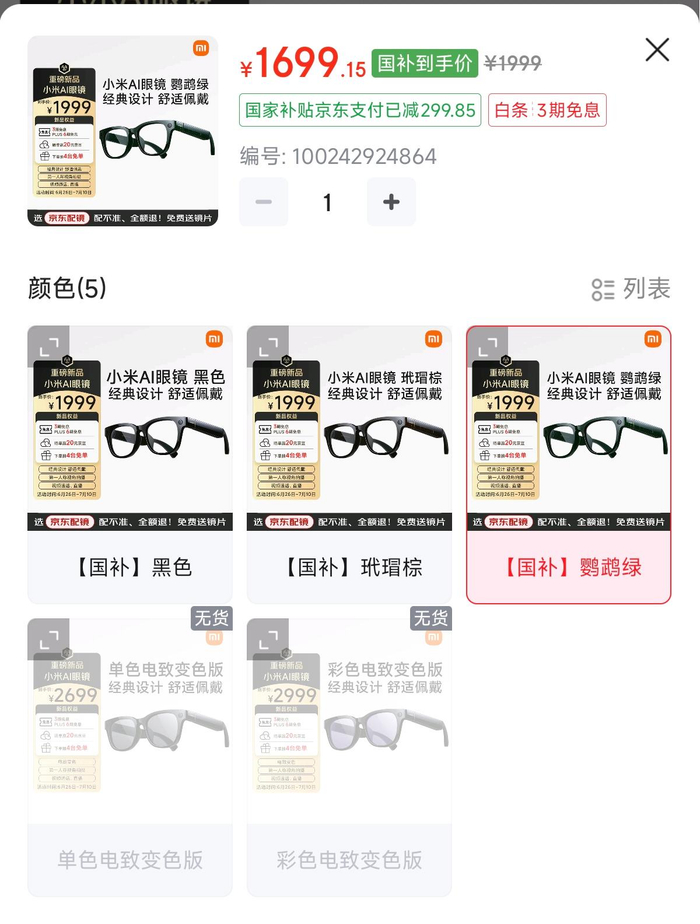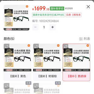 观察者网注意到,京东APP此前已上线小米AI眼镜并开启预约,截至发布前预约人数超3.2万人。目前,小米AI眼镜已在京东等多个购物平台正式上线。在售价方面,小米AI眼镜标准版1999元,单色电致变色版2699元,彩色电致变色版2999元。值得注意的是,在购物平台上,单色电致变色版及彩色电致变色版均显示无货状态,而售价1999元的标准版能够在部分地区享受国补,价格进一步下探到1699元左右。