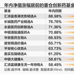具体来看,今年重仓创新药基金净值涨幅TOP10为:汇添富香港优势精选A(88.98%)、长城医药产业精选A(76.76%)、永赢医药创新智选A(71.36%)、中银港股通医药A(70.88%)、华安医药生物A(66.93%)、诺安精选价值A(65.71%)、平安核心优势A(63.73%)、嘉实互融精选A(61.29%)、中银大健康A(58.81%)、汇添富健康生活一年持有A(58.49%)。