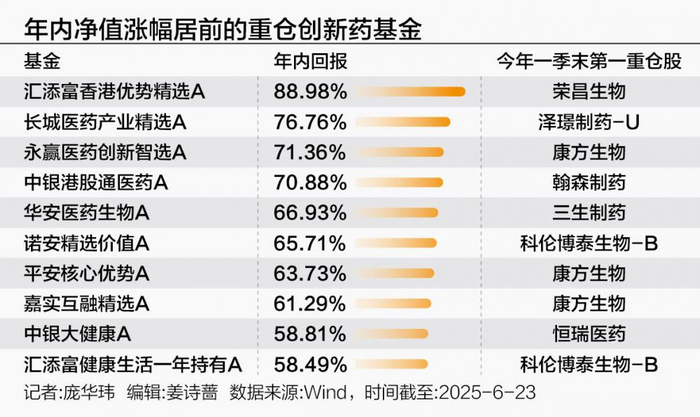 截至6月23日,年内涨幅超50%的36只基金(只计算初始基金,下同),有31只重仓创新药,占比86%。汇添富香港优势精选A以88.98%的回报暂居年内冠军。