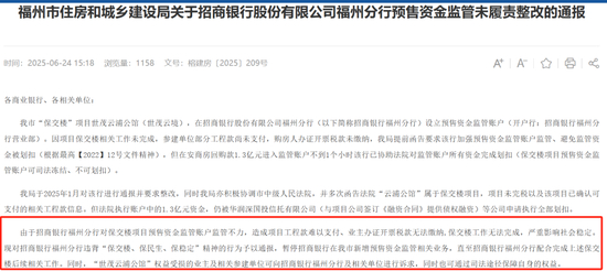 6月24日,一则《福州市住房和城乡建设局关于招商银行股份有限公司福州分行预售资金监管未履责整改的通报》,赫然出现在了福州市住建局的官网。
