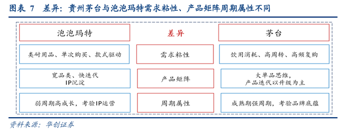 共性:二者均兼具卓越消费、收藏和金融属性。茅台基础需求即为核心客群饮用需求,消费粘性强复购率高,早期限于产能限制,供不应求成为常态,叠加独特越沉越香属性,延伸出更高维度的收藏、投资需求,三种需求往往集中于标品一身。而泡泡玛特的产品体系主要分为三类,一是限量款产品,最高市场价值已突破百万量级;二是隐藏款产品,由于稀缺性被溢价炒作;三是普通标品,具备挂件的功能消费属性和带有情绪或态度的文化消费属性以及通过盲盒玩法和概率设计增加社交消费属性,共同构成其基础消费属性。泡泡玛特独特属性分散在IP标品、隐藏款、限量款中,其中价格是其属性的标签体现。