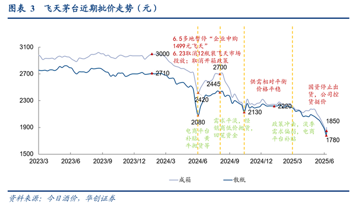 6月当下酒企正经历压力测试,飞天批价跌破2000元。24年12月至今年3月公司通过灵活投放生肖/小茅/公斤装等战术产品保障增长,飞天供需相对良性平衡,批价也稳定在2200元中枢水位。4月后飞天批价开始承压下行、向2100元位置靠近,在年中回款发货、电商促销等冲击下,行业本就有加大批价下行压力,去年6月飞天散瓶批价也一度跌破2100元。但今年政策执行加码导致飞天批价下探幅度大于预期,近期部分区域批价已跌至1900元。