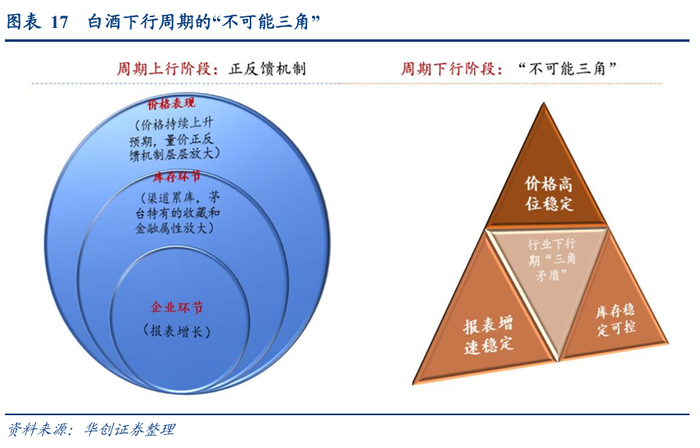 当下需求压力,放大“不可能三角”矛盾。我们在去年在茅台深度报告提出:需求逆转打破原有平衡后,行业上行期“供需-累库和涨价”的正反馈难以为继,反而酒企经营均面临“增长-去库和稳价”的三角矛盾,经营管理较差的酒企在三角矛盾中走向失控,底牌充足的酒企能保全自身,但考验清晰的判断和经营抉择。