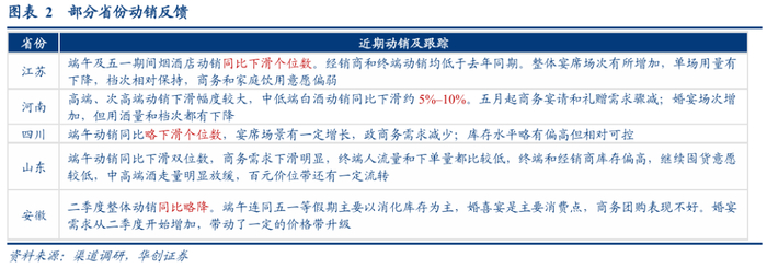 分区域看,四川、江苏展现一定韧性,河南、山东压力较大。结合渠道反馈,江苏、四川Q2整体动销下滑幅度相对较小,主要系婚宴有一定支撑,部分地区消费档次没有明显下降。酒类消费大省山东、河南反馈下滑幅度较大,一方面地方政府对禁酒执行较严,另一方面前期库存偏高、渠道抗压能力相对较小。