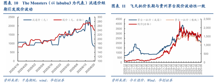 价差反映增长预期,阶段性支撑估值溢价。市值本质上是对企业经营业绩的折现,贵州茅台与泡泡玛特核心单品一、二级市场均有价差,是收藏与金融属性的外化反应,亦蕴含未来业绩增长的潜力及确定性,市场对应给予高于行业的估值水平。区别在于泡泡玛特股价短期波动与某一IP关联度高,伴随不断迭代,其单一IP对股价的影响不断弱化,股价长期表现更依赖于业绩增长兑现,而市场多年来将飞天茅台作为茅台产品代表,将飞天渠道利润视为可收回利润空间,历史上看批价与股价走势一致性高,但当下飞天茅台整体收入占比已较前期明显下降,建议理性看待飞天价差与未来业绩关联度。