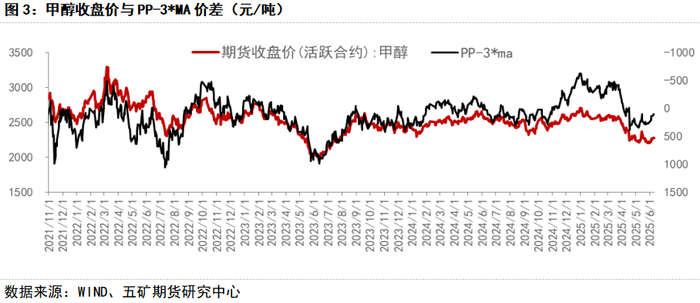 从实用性指标来看,PP-3MA价差与甲醇价格走势存在着明显的负相关关系,且该价差具有比较明显的上下边界,价差高点的时候说明MTO利润丰厚,甲醇下游需求较好,甲醇价格相对低估,后续价格有上行驱动,反之则说明下游利润较差,后续有下游停车发生负反馈的风险,此时甲醇价格相对高位,后续有回落的风险。该价差是为数不多的可以用来判断甲醇价格相对高低的指标,对于中长短期行情的判断具有指导意义。