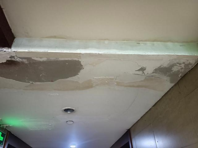 楼道屋顶墙皮脱落,有洇湿痕迹。