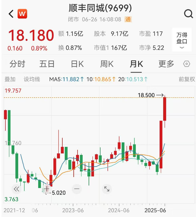 相似的故事发生在了中国的零售行业,当美团、京东、阿里巴巴、甚至拼多多以及抖音等互联网大厂们,为了兵家必争之地的即时零售,而拼的你死我活之际,以顺丰同城(9699.HK)、闪送(FLX.US)、达达(2025年6月17日被京东私有化退市)为代表的即时零售“卖铲人”:即时配送行业,闷声发起了大财。以顺丰同城为例,从4月底收盘价算起,截止到2025年6月26日,短短两个月不到的时间内,股价已上涨了129.55%。