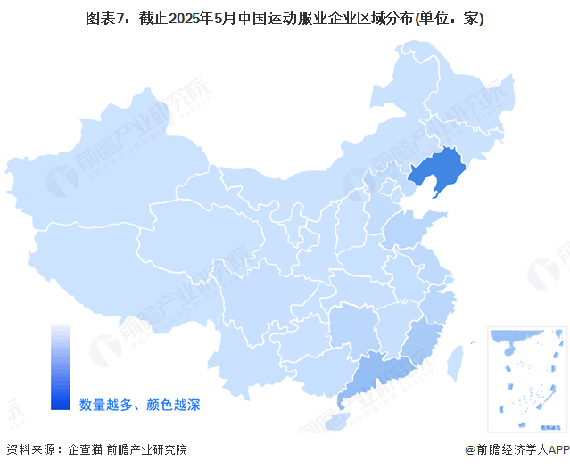 通过企查查平台查询行业为“运动服装制造(企查查行业代码:19020102)”、登记状态为“存续/在业”的企业,截至2025年5月25日,中国相关企业4543家,从运动服制造企业的区域分布情况来看,主要分布在辽宁省,省内集聚着1726家运动服装制造企业;其次是广东省和福建省,运动服装制造企业数量分别为685家和449家,三省企业数量合计占比全国62.2%。