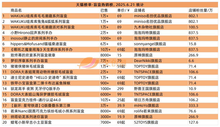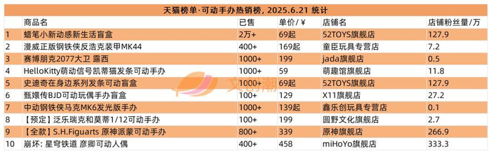 接下来,本期我们继续观察盲盒与手办的爆款产品,随后各类文创产品与店铺的一周榜单,以及国产IP相关店铺表现。