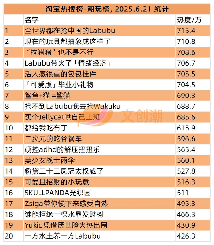 淘宝热搜潮玩榜,每日实时更新,文创潮6月21日统计到的前五名分别是: