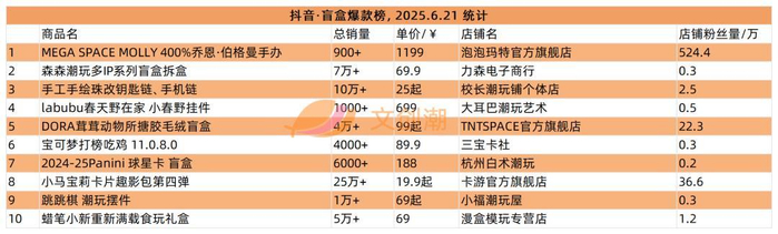 在实时更新的抖音盲盒热销榜,文创潮6月21日统计到的前五名如图所示。