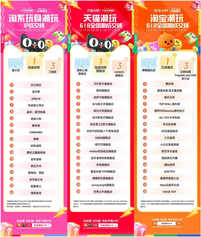 本周是618大促收官。今年天猫潮玩618全周期成交榜,前二十分别为: