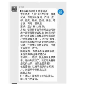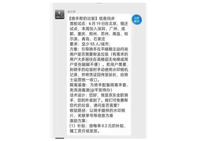 据网传截图,在外卖群中,有人发布信息称,从6月19日起,在北京、宿迁首批试点外卖员帮用户扔垃圾,后续又加入深圳、广州、成都等10个城市。