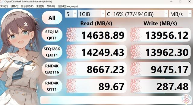 这款PCIe 5.0固态在蓝宝石 PULSE 脉动B850MP WIFI主板上连续读取速度达到14638.89MB/s,连续写入速度达到13956.12MB/s,跑出了PCIe 5.0带宽满血水平。