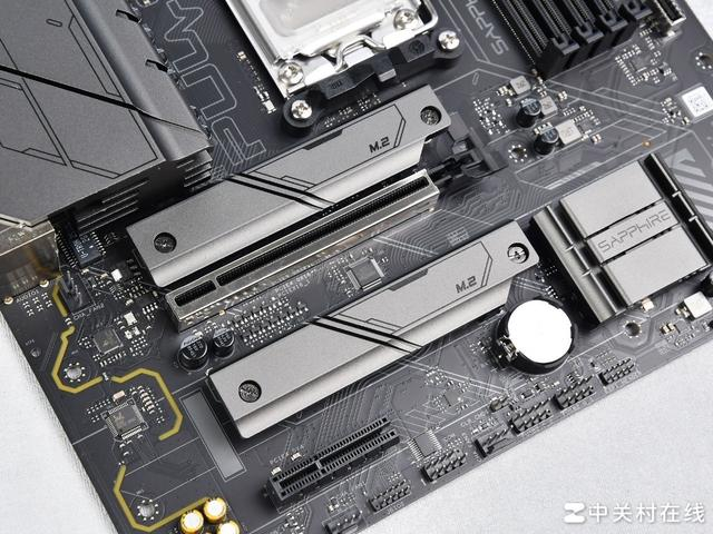 蓝宝石 PULSE 脉动B850MP WIFI主板这次没有采用下沉式M.2设计,将M.21槽放置于PCIe 1槽上方,这根PCIe 1槽支持PCIe 4.0x16带宽,并且使用合金插槽设计,剩下一根PCIe 2短插槽支持PCIe 4.0 x4带宽,用于拓展网卡、声卡等I/O设备。