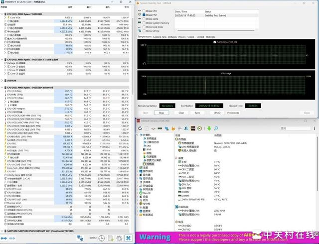 我们下面测试一下这款主板的供电散热抗压能力,使用AIDA64进行拷机测试,检测蓝宝石PULSE脉动B850MPWIFI主板能否顶住锐龙 7 9800X3D的负载。