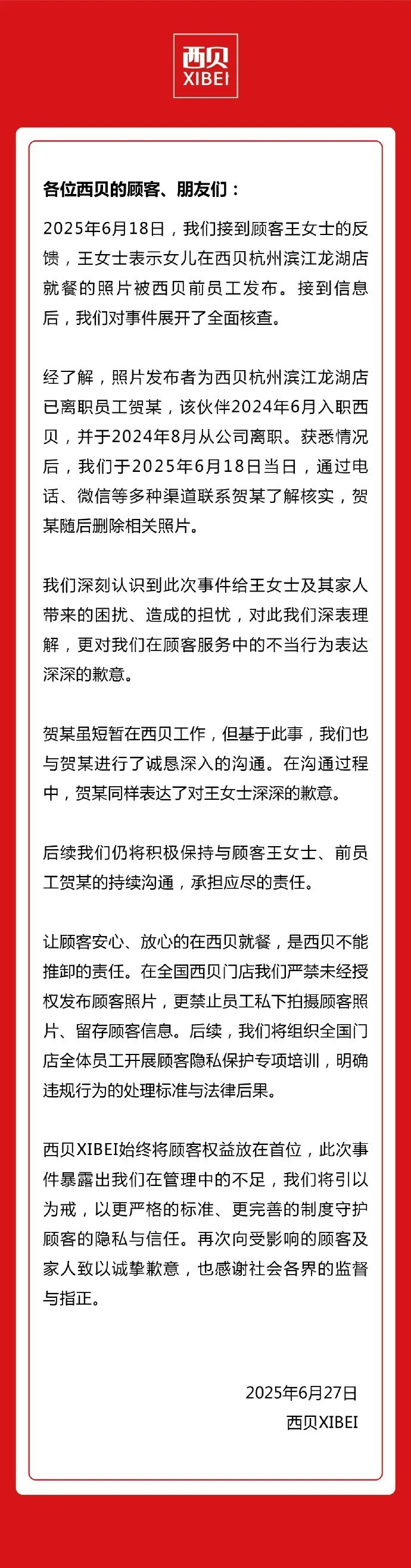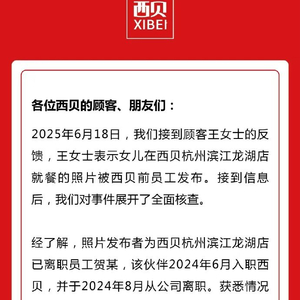 对此,西贝餐饮官微27日发声明表示,经核查,涉事员工为已离职员工贺某,经沟通贺某已经删除相关照片。西贝对于贺某在顾客服务中的不当行为表达深深的歉意。