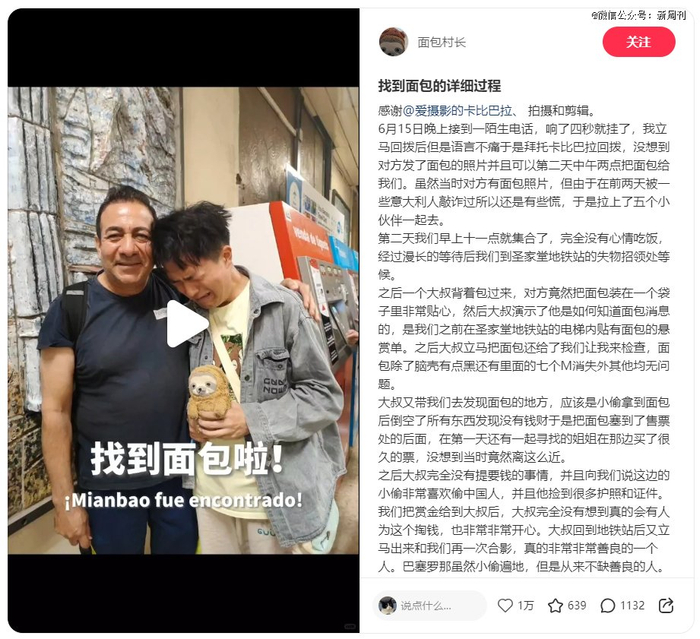 整整7天后,奇迹突然降临,一位西班牙大叔捡到了被小偷扔掉的“面包”,并根据悬赏告示拨通了“村长”的电话。小红书上,近4万网友为“面包”与“村长”重逢的视频点赞,上千人在评论区“抱头痛哭”。其中一条热评是这么总结的:“‘面包’独自旅行了一圈,在父亲节当天回到了爸爸的身边”......