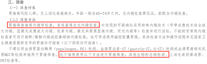不建议将血清胃蛋白酶原(PG)检测、血清胃泌素-17(G-17)检测或血清胃癌相关抗原MG7等检测单独用于胃癌筛查,也不推荐使用其他生物标志物检测、上消化道钡餐造影、PET检查等进行胃癌筛查。
