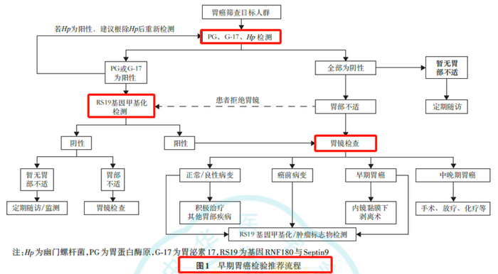 为进一步规范早期胃癌检验流程,在此结合各个技术以及标志物检测的特点和适用场景,从早期胃癌检验技术角度出发作出检验推荐流程。针对胃癌筛查目标人群,对胃癌高危人群进行PG、G-17和HP检测,当任意一项检测结果为阳性时,建议进行RS19基因甲基化检测。当基因甲基化检测也呈现阳性时,应及时进行胃镜检查,排除癌症风险。