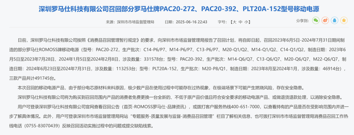 而两天后,深圳市市场监督管理局就发布公告,深圳罗马仕科技有限公司将从即日起,召回2023年6月5日-2024年7月31日期间制造的部分批次/型号移动电源,共涉及三款产品,总量高达491745台。