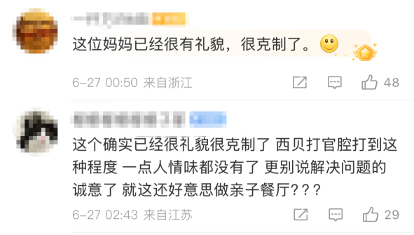 有网友表示,“让一个暑假工轻易拿到会员的资料,门店有不可推卸的责任。”“西贝打官腔没有一点人情味,更别说解决问题的诚意,还好意思做亲子餐厅吗?”