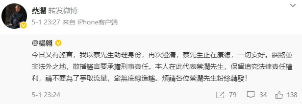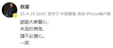 早前,蔡澜曾被传病危。4月29日深夜,蔡澜通过个人微博给网友报平安,亲自辟谣其“健康状况堪忧”的传闻。5月1日深夜,蔡澜再次转发微博辟谣。