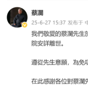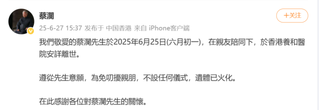 6月27日,蔡澜个人微博发布消息称:我们敬爱的蔡澜先生于2025年6月25日(六月初一),在亲友陪同下,于香港养和医院安详离世。